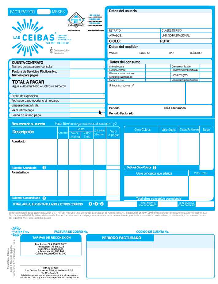 Encuentra toda la información para pagar, consultar y gestionar tu factura de agua y alcantarillado de Las Ceibas Empresas Públicas de Neiva.